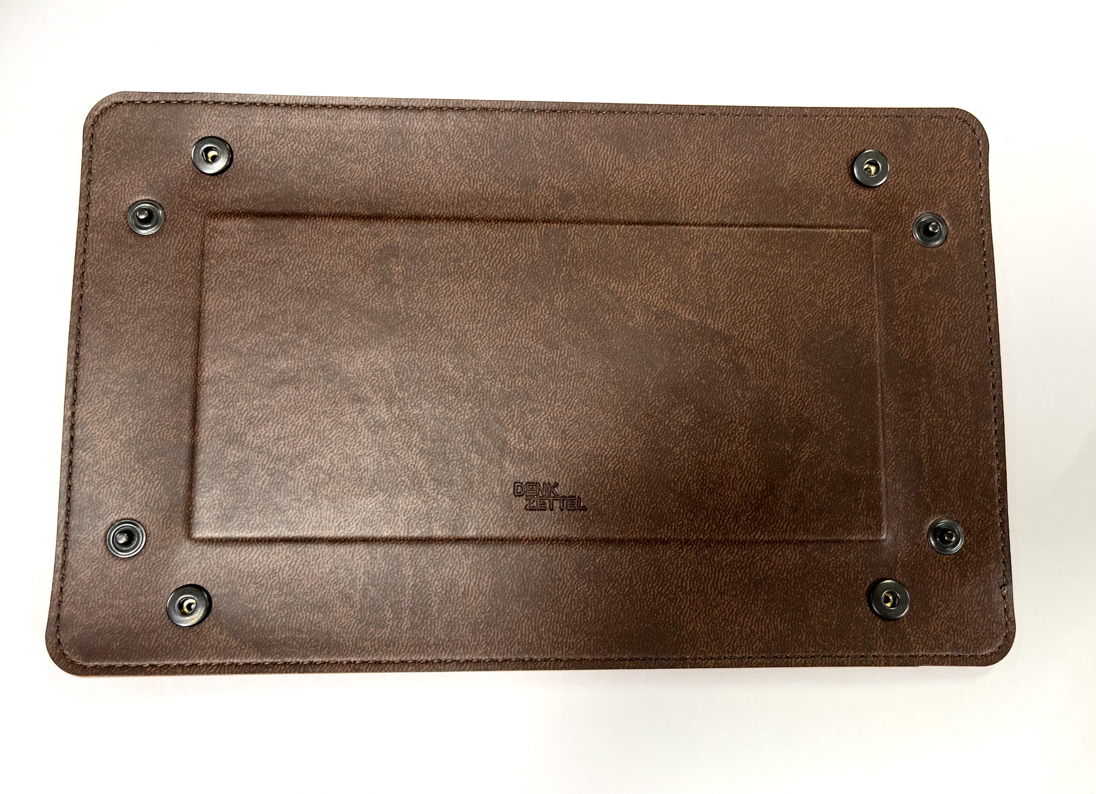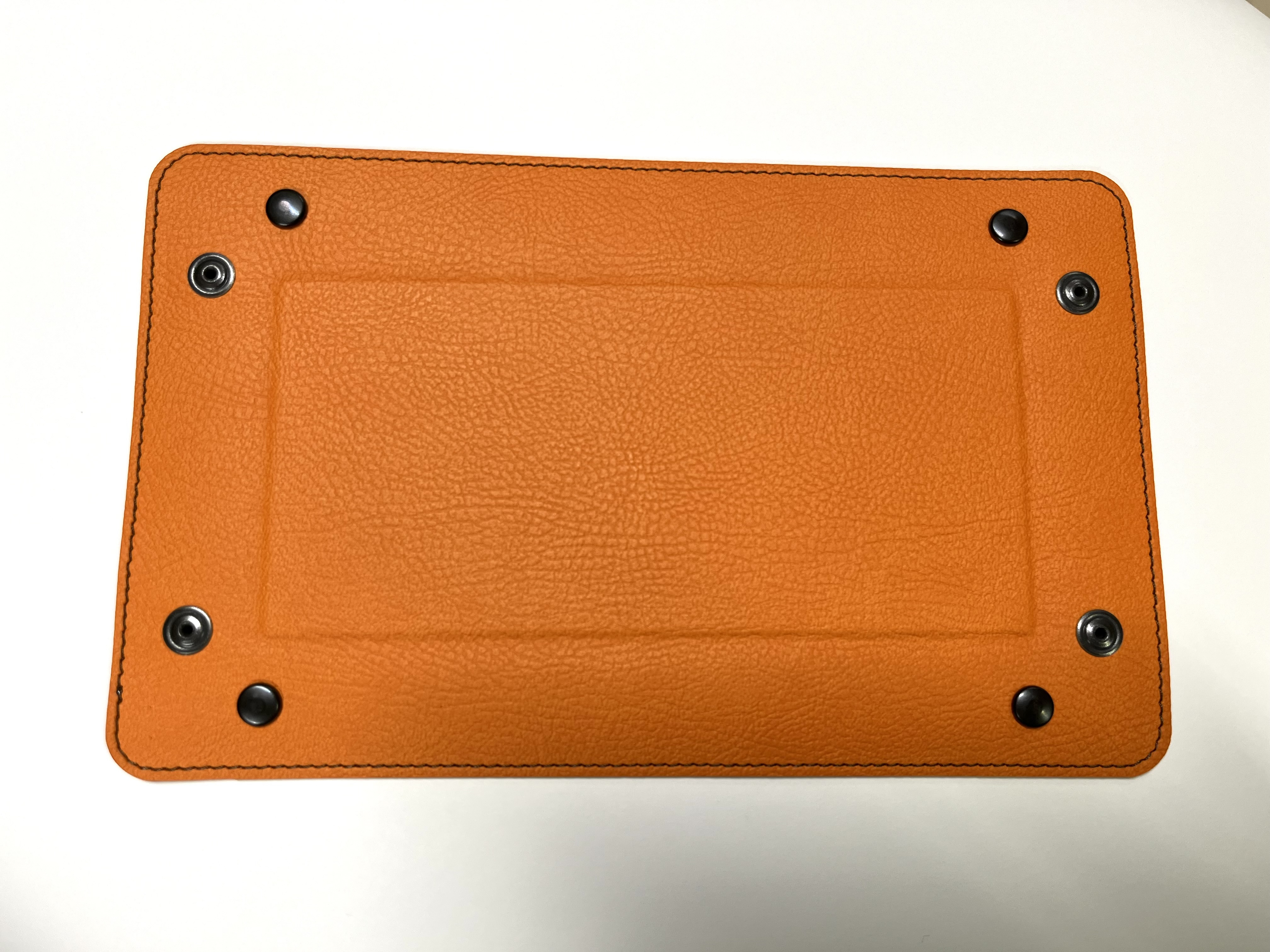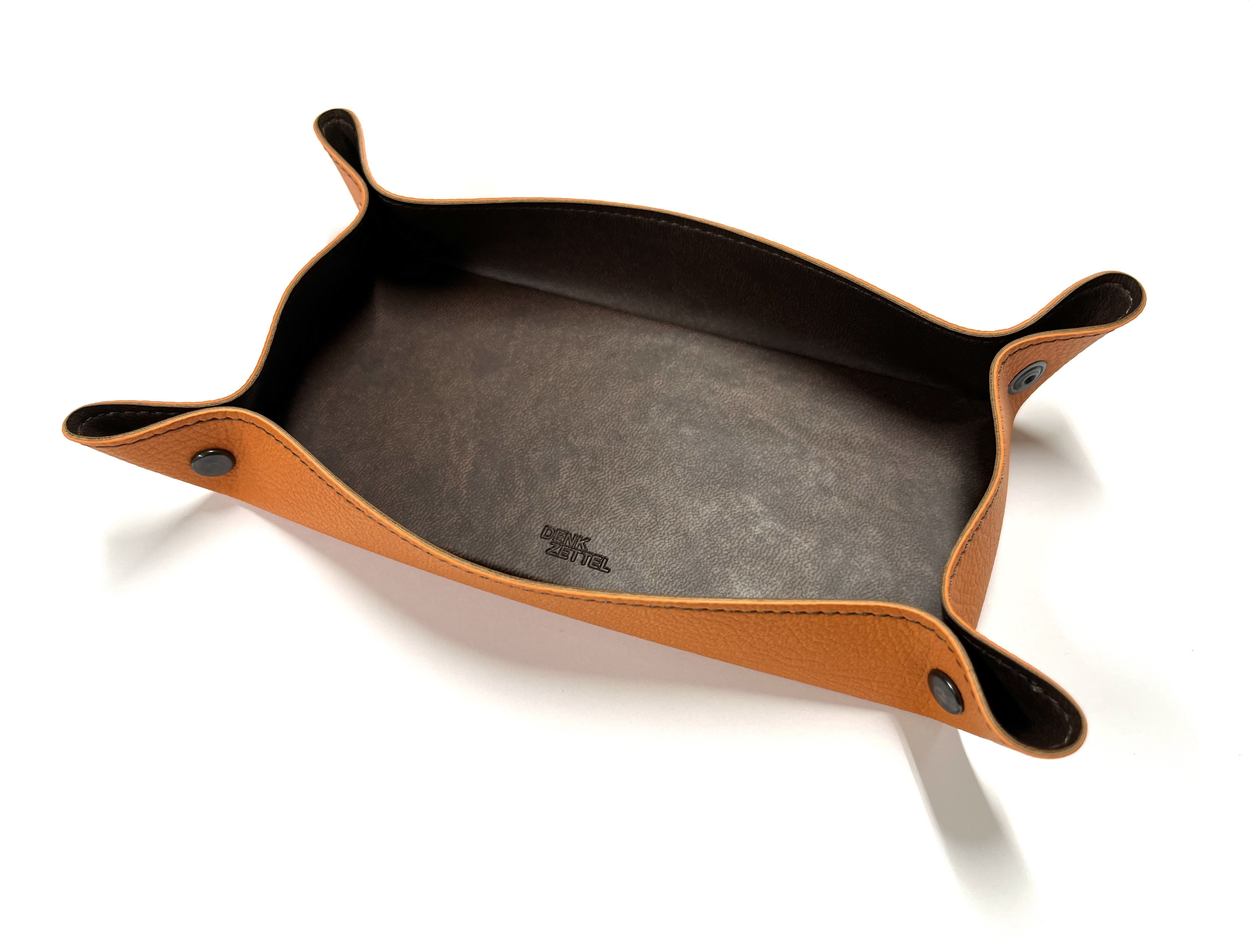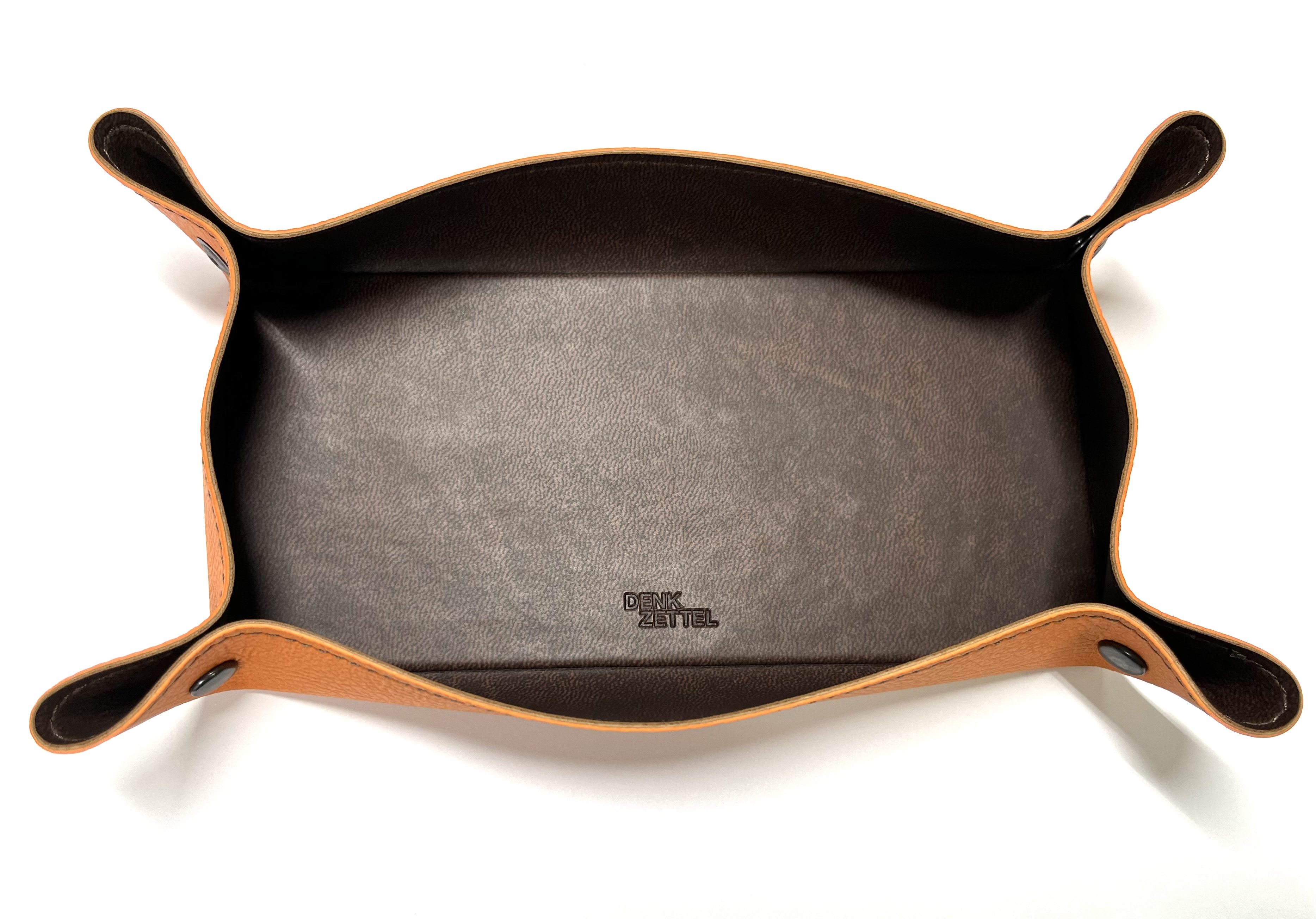 DenkZettel Taschenleerer aus genarbtem Lederlook in Orange und brauner Rahmennaht.